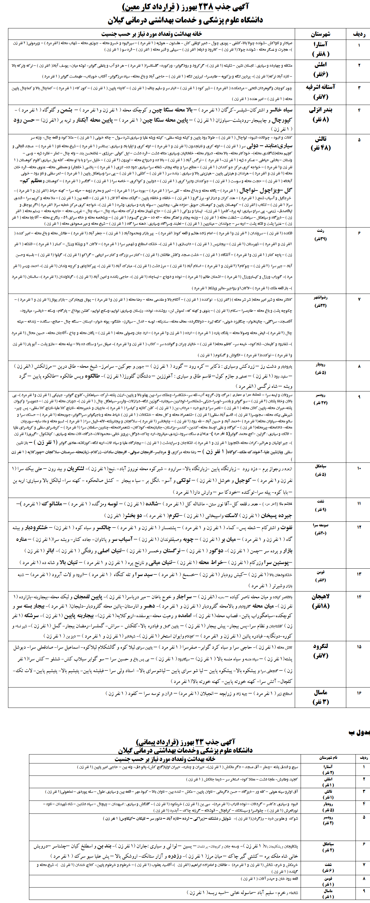 به گزارش پایگاه خبری لشت نشا خبر، دانشگاه علوم پزشکی و خدمات بهداشتی درمانی استان گیلان در نظر دارد به منظور تامین بهورز مورد نیاز خانههای بهداشت روستاهای تابعه طبق دستورالعمل اجرایی جذب بهورز، مفاد نامه شماره ۲۰۹/۸۵۱۷/د مورخ ۹۸/۱۰/۱۷ معاونت توسعه مدیریت، منابع و برنامه ریزی وزارت بهداشت، درمان و آموزش پزشکی، تبصره ۶ ماده ۳۴ آیین نامه اداری استخدامی تشکیلاتی کارمندان غیرهیات علمی و مصوبات کارگروه آزمون دانشگاه بر اساس مجوزهای ۲۰۹/۸۷۶۶/د مورخ ۱۱/۰۴.۱۳۹۶ و ۲۰۹/۵۴۷۹/دمورخ ۰۶/۱۵.۱۳۹۸)مجوز شماره ۱۵۱۶۰۹مورخ ۱۳۹۸/۰۳/۲۷ سازمان اداری استخدامی کشور) تعداد۲۳۸ نفر (بصورت قرارداد کار معین) مطابق جدول (الف) و تعداد ۲۳ نفر (بصورت پیمانی) مطابق جدول (ب) از فارغ التحصیلان مقطع کارشناسی و کاردانی در رشتههای تحصیلی مورد نیاز و در صورت نداشتن متقاضی کارشناس یا کاردان مرتبط بهداشتی بومی واجد شرایط این آگهی از دیپلم کامل متوسطه واجد شرایط و بومی ثبت نام و از طریق آزمون عمومی، تخصصی، مصاحبه علمی و گزینش به صورت قرارداد انجام کارمعین و پیمانی پذیرش نماید.