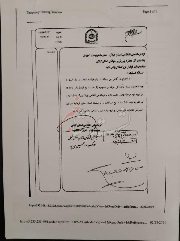 به گزارش پایگاه خبری لشت نشا خبر، پس از ارسال این نامه به اداره کل ورزش و جوانان گیلان، این اداره کل در نامهای از هیأت فوتبال گیلان اعلام نظر خواست که در متن این نامه آمده بود: «احتراماً، به پیوست نامه شماره در ۳۳/۱۸/۴/۱۳ مورخ ۹۹/۱۲/۰۳ فرماندهی انتظامی استان گیلان، با موضوع انتقال تیم فوتبال پاس ناجا از استان گیلان به فرماندهی انتظامی تهران، شایسته است ضمن بررسی ابعاد فنی و اجتماعی موضوع، نتیجه را به این معاونت اعلام نمائید. مزید تشکر و امتنان است.»