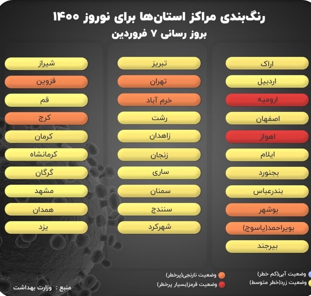وضعیت قرمز: ارومیه (آذربایجان غربی)، دهلران (ایلام)، امیدیه، اندیمشک، خرمشهر و مسجد سلیمان (خوزستان)، ارسنجان و داراب (فارس)، اسلام آباد غرب (کرمانشاه) و بروجرد (لرستان) از امروز در وضعیت قرمز قرار گرفتند.