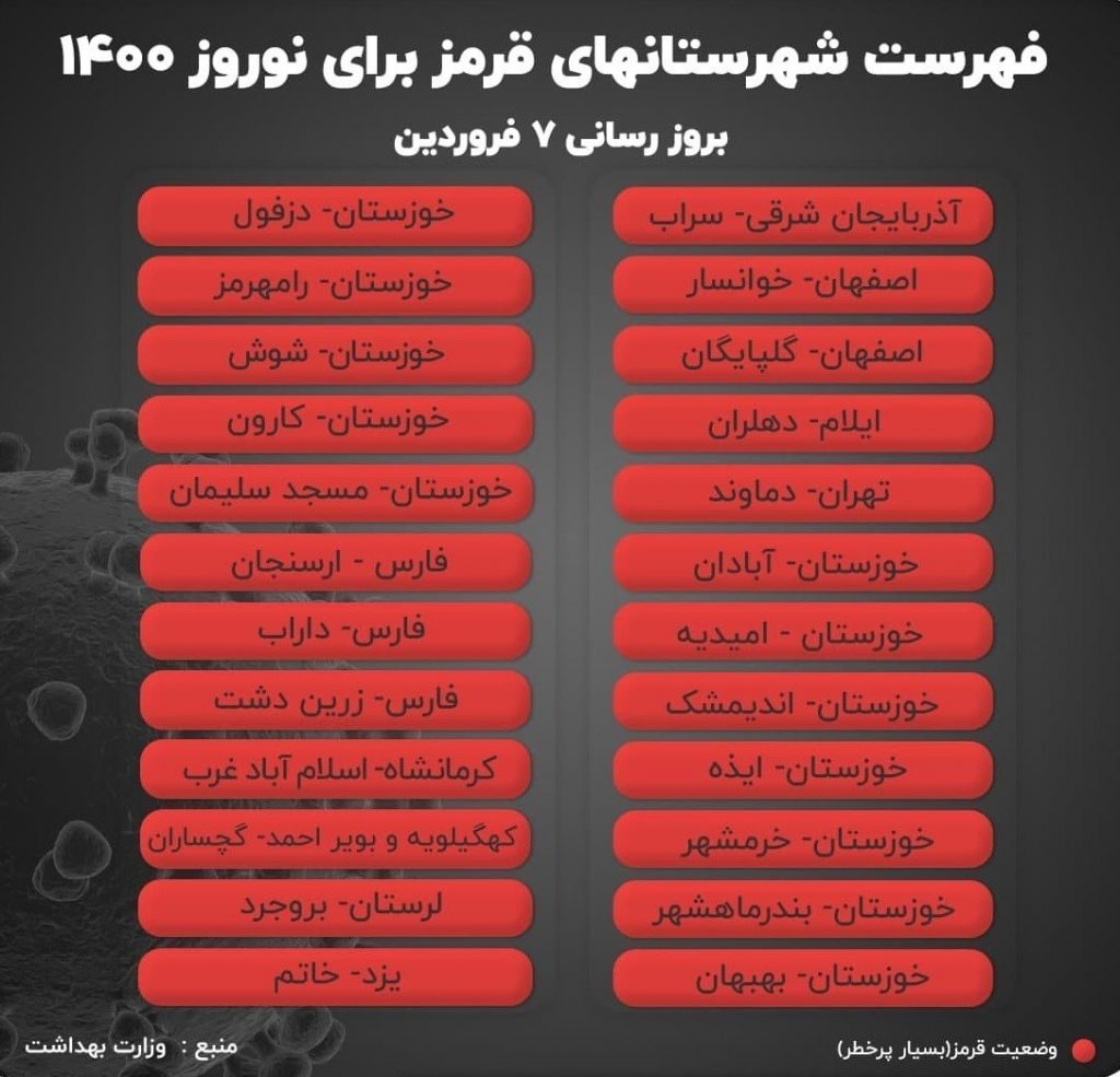 بر این اساس سفر از/به شهرهای قرمز و نارنجی از ۲۵ اسفند ۹۹ تا ۱۵ فروردین ۱۴۰۰ ممنوع است؛ شهرهای با وضعیت قرمز که تردد به آنها از ۲۵ اسفند ۹۹ تا ۱۵ فروردین ۱۴۰۰ با ممنوعیت همراه است و ورود پلاکهای غیربومی به این شهرها یک میلیون تومان جریمه در پی خواهد داشت.