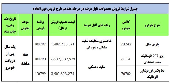 در این طرح ۳ محصول پارس سال، پژو ۲۰۷ اتوماتیک سقف شیشهای و دناپلاس توربوشارژ اتوماتیک با موعد تحویل حداکثر سه ماهه عرضه شده است.