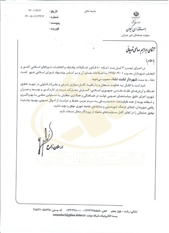 به گزارش پایگاه خبری لشت نشا خبر، حکم انتصاب ابراهیم صالحی توچائی به عنوان شهردار لشت نشا صادر شد.