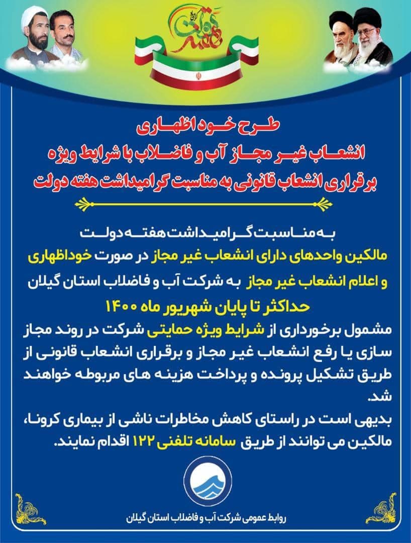 رضا سبحانی، معاون خدمات مشترکین و درآمد با اشاره به فراهم شدن شرایط ویژه حمایتی گفت: به مناسبت گرامیداشت هفته دولت با اجرای طرح خود اظهاری مالکین واحدهای دارای انشعاب غیر مجاز تا پایان شهریورماه ۱۴۰۰ فرصت دارند تا انشعابات غیر مجاز را به انشعابات قانونی تبدیل کنند.