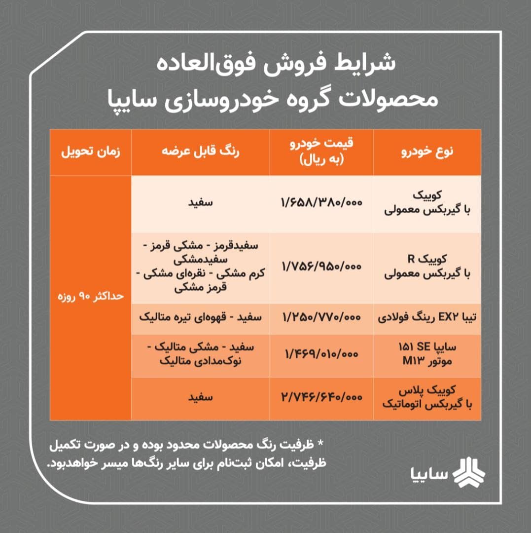 در طرح جدید فروش فوق العاده محصولات سایپا، خودروهای کوییک با گیربکس معمولی، کوییکR با گیربکس معمولی، تیبا EX2 رینگ فولادی، سایپا SE151 موتور M۱۳ و کوییک پلاس با گیربکس اتوماتیک عرضه میشود.