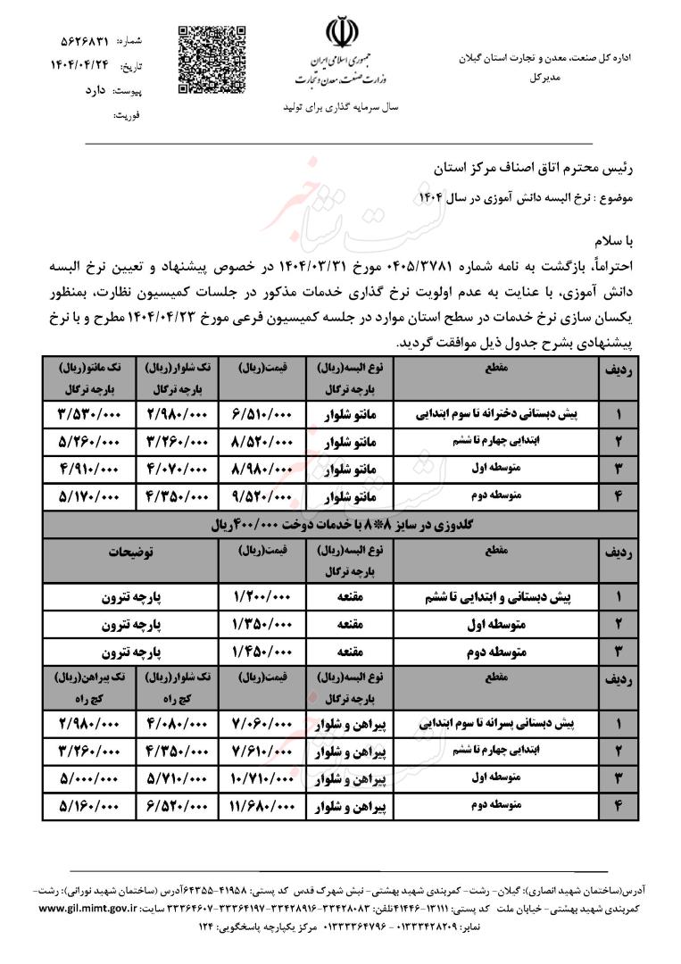 عطایی در بخش دیگری از سخنانش با اشاره به اعلام نرخ پوشاک دانش آموزان اظهار داشت: طبق شیوه نامه الکترونیکی لباس فرم دانشآموزان، نرخ نامه انواع پارچه و اندازه لباس توسط اداره کل صنعت و معدن به اداره کل آموزش و پرورش استان اعلام شده است.