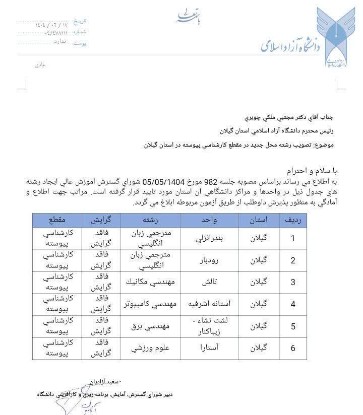 رئیس دانشگاه آزاد اسلامی استان گیلان، تاکید کرد: رشته «مهندسی مکانیک» در واحد دانشگاهی تالش، «مهندسی کامپیوتر» در آستانه اشرفیه، «علوم ورزشی» در واحد آستارا و رشته «مهندسی برق» در مرکز دانشگاهی لشت نشا و زیباکنار از دیگر رشتههای ابلاغی و مورد تایید شورای گسترش آموزش عالی میباشد.