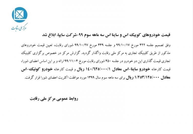 مطابق تصمیم شورای رقابت که از طریق کلینیک تجاری صورت گرفته است، قیمت خودروی کوییک اس، ۱۲۵ میلیون و ۳۱۲ هزار و ۵۰۰ تومان و ساینا اس ۱۴۰ میلیون و ۶۲۵ هزار تومان برای سه ماهه سوم سال ۹۹ تعیین شده است.