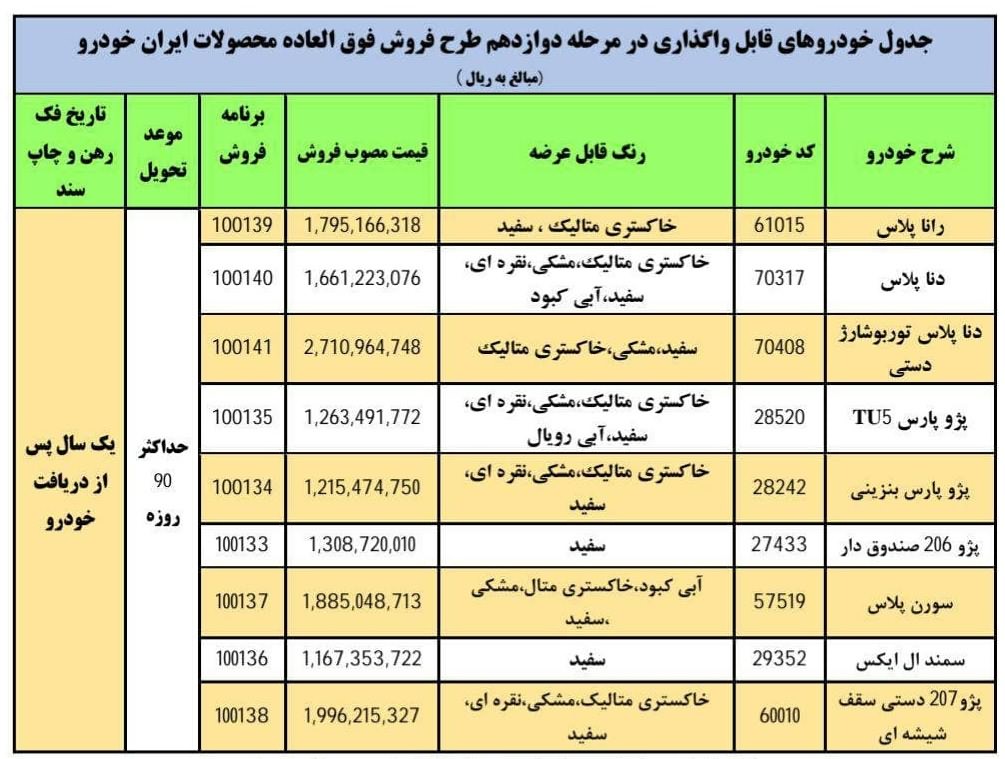 گروه صنعتی ایرانخودرو به مناسبت فرا رسیدن چهل و دومین سالروز پیروزی انقلاب اسلامی، دوازدهمین مرحله فروش فوقالعاده محصولات خود را از سهشنبه 14 بهمن به مدت سه روز به اجرا میگذارد.